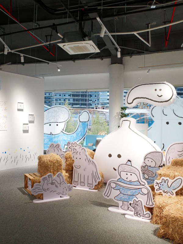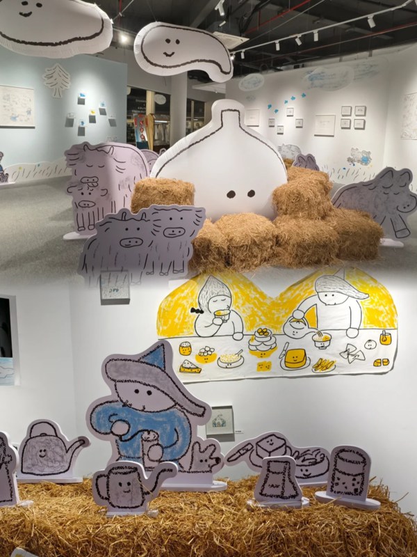 There's usually something on display near the Salmon Bookstore on the second floor. Last rotation was an Inner Mongolia illustration series called "I Have a Friend" (《我有一个朋友》). Blue and white tones with bright yellow accents. Very gentle aesthetic. Exhibitions change every month or so—there's no strict schedule posted. The bookstore itself stocks Chinese and some English titles. I've seen discount stickers on certain books, maybe 20-30% off, but you have to browse to find them. CyPARK Chengdu positions itself as a cultural space, not just retail.