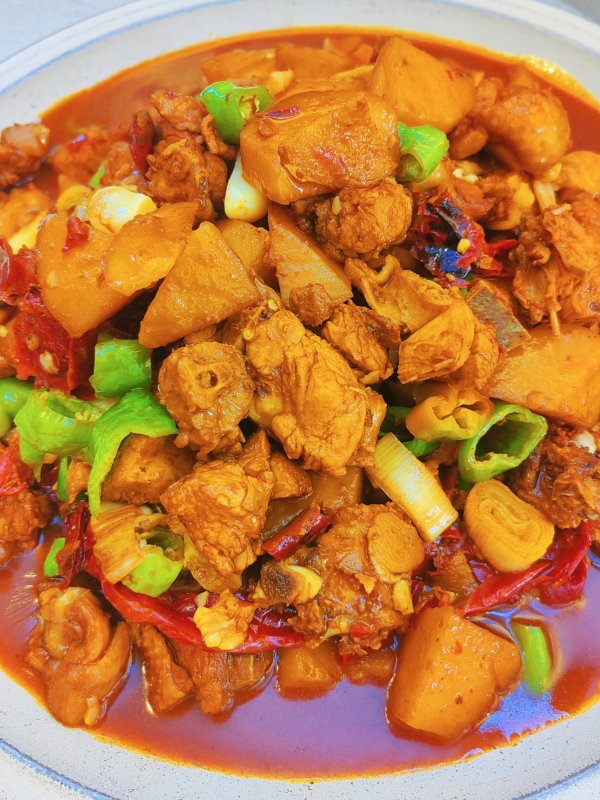 Da Pan Ji (大盘鸡): A large twin dish portion of chicken, potatoes, green pepper and wide noodles. The chicken is soft and tender, potatoes soft and糯and all in a sauce, the richness of which is completely soaked up in the noodles.