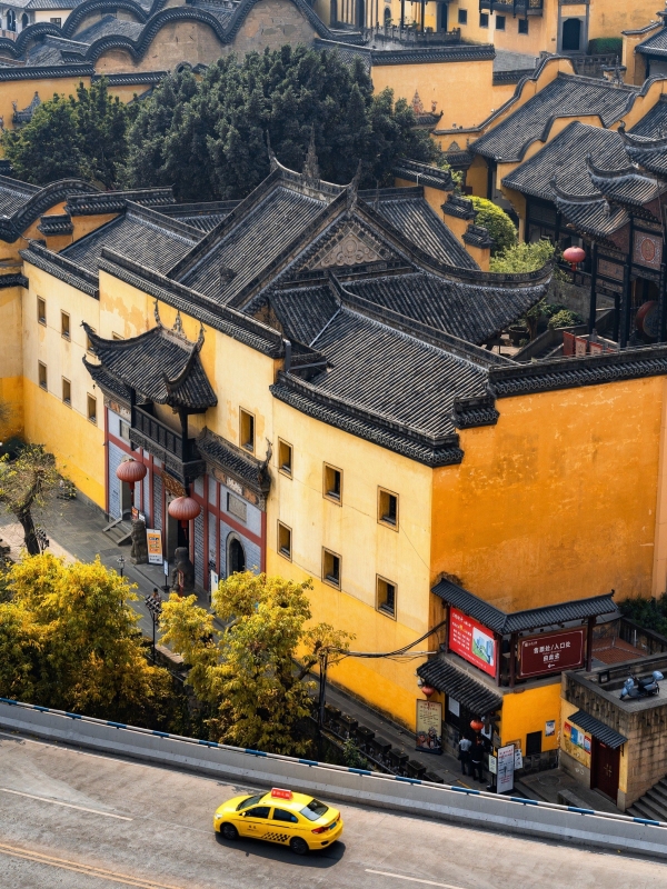 There’s this moment when you first see Huguang Guild Hall that literally stops you in your tracks. You’re walking down from Xiaoshizi metro station and wandering through the maze of old Chongqing when—boom—there are these radiant yellow walls against the grey of the Yangtze spilling out to meet the sleek cables of Dongshuimen Bridge looming in the skyline. Someone just kind of photoshopped ancient China against a backdrop of modernity.