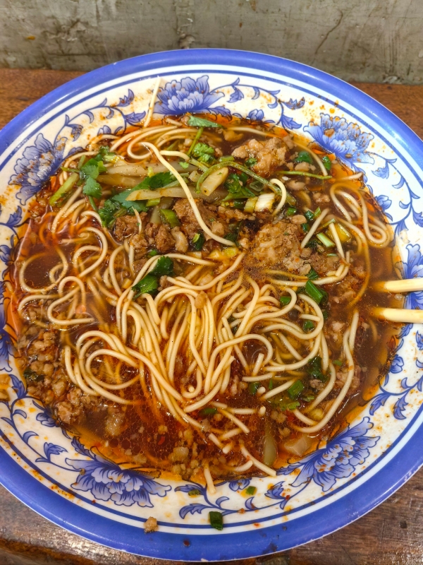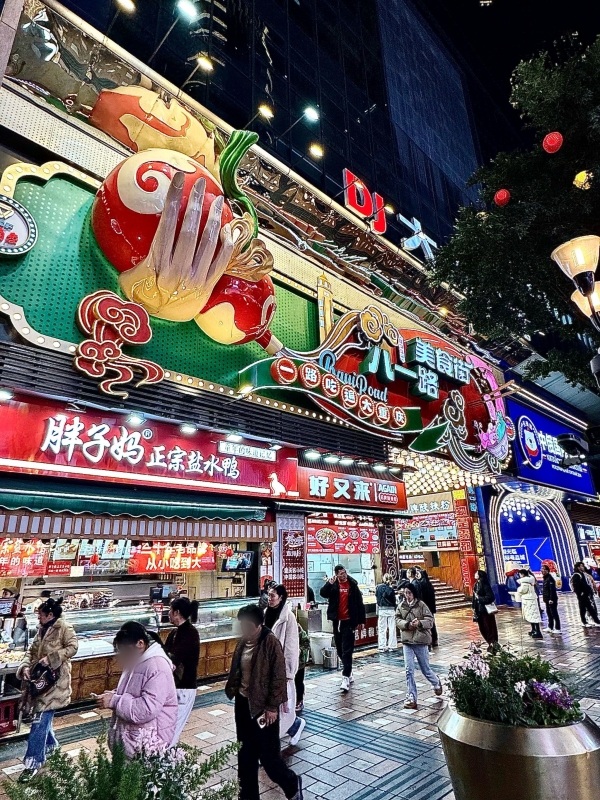 Bayi Snack Street saved so many of my shopping days. Sour and spicy noodles for ¥15, Shancheng Tangyuan for ¥8, Dan Dan noodles for ¥12. Night changes the place completely. The crowds thin out a little after 22:00. What neon there is shines on the wet pavement after a Chongqing rainstorm.