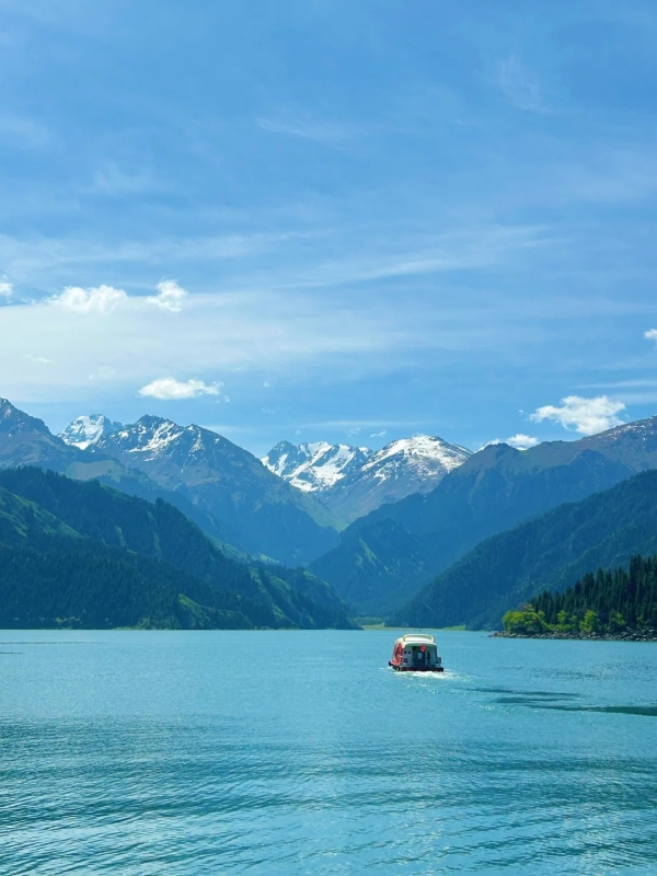 Tianchi (Heavenly Lake) is a stunning crescent-shaped alpine lake just a two-hour drive from Urumqi. Its glacial waters are an impossibly vivid blue—so clear they perfectly mirror the surrounding Tianshan Mountains, including the 5,445-meter snow-capped Bogda Peak towering overhead.