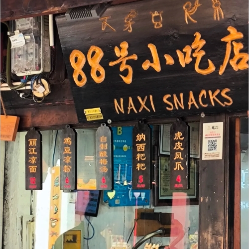 Try 88号小吃店 (88 Hao Xiaochi Dian) at 88 Wu Yi Street—rough décor, plastic stools, great food. Blood sausage, baba flatbread, and chicken bean jelly go for 12–20 RMB. No tourist markup, just honest Naxi flavors done right.