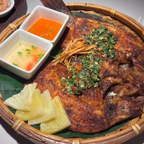 The scent is unreal—smoky lemongrass and citrus drifting through the air. The skin crisps up while the inside stays tender and juicy. It’s bright, herby, and way lighter than typical soy-based Chinese fish. Every bite bursts with heat and sweetness from the fresh catch.