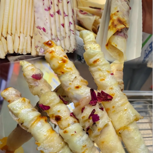 Street vendors bring it to life again. They soften a sheet, deep-fry it golden, and roll it on a stick. Sweet ones get sugar or rose jam; savory ones get chili or bean paste. Think of it as mozzarella meets a crepe, crispy outside and creamy inside. You’ll find rushan all over Dali and Xizhou for 10–15 RMB a stick. Go early when the oil’s clean and the air smells buttery. It’s mild, sweet, and a bit tangy—some call it weird, but most can’t stop at one bite.