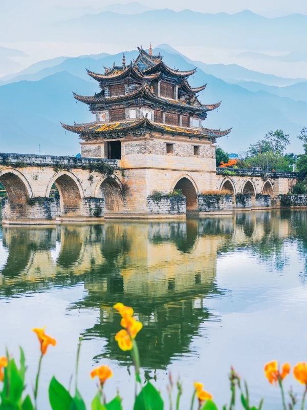 The 17-arch Shuanglong Bridge (Twin Dragon Bridge) is over the coming together of the Lujiang and Tachong rivers, and the effect of structure and reflection on the water gives a complete and perfect union, and a unique sample of the ancient bridge engineer's skill. The Zhu Family Garden in the town, called the "Grand View Garden of Southern Yunnan," possesses in its exquisite carved beams and painted rafters the architectural art of the southern Yunnan dwellings.