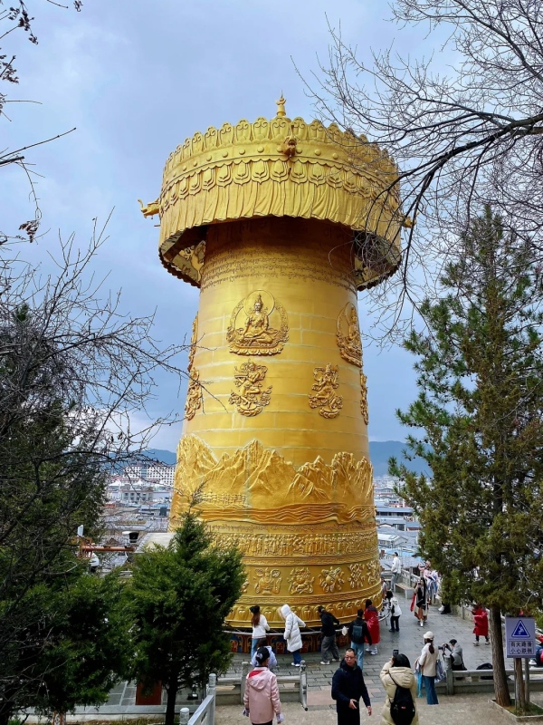 A massive 2014 fire destroyed 300 buildings here. What you see mixes reconstruction with surviving Tibetan architecture. The world's largest prayer wheel sits in Guishan Park—requiring at least 10 people to spin properly.